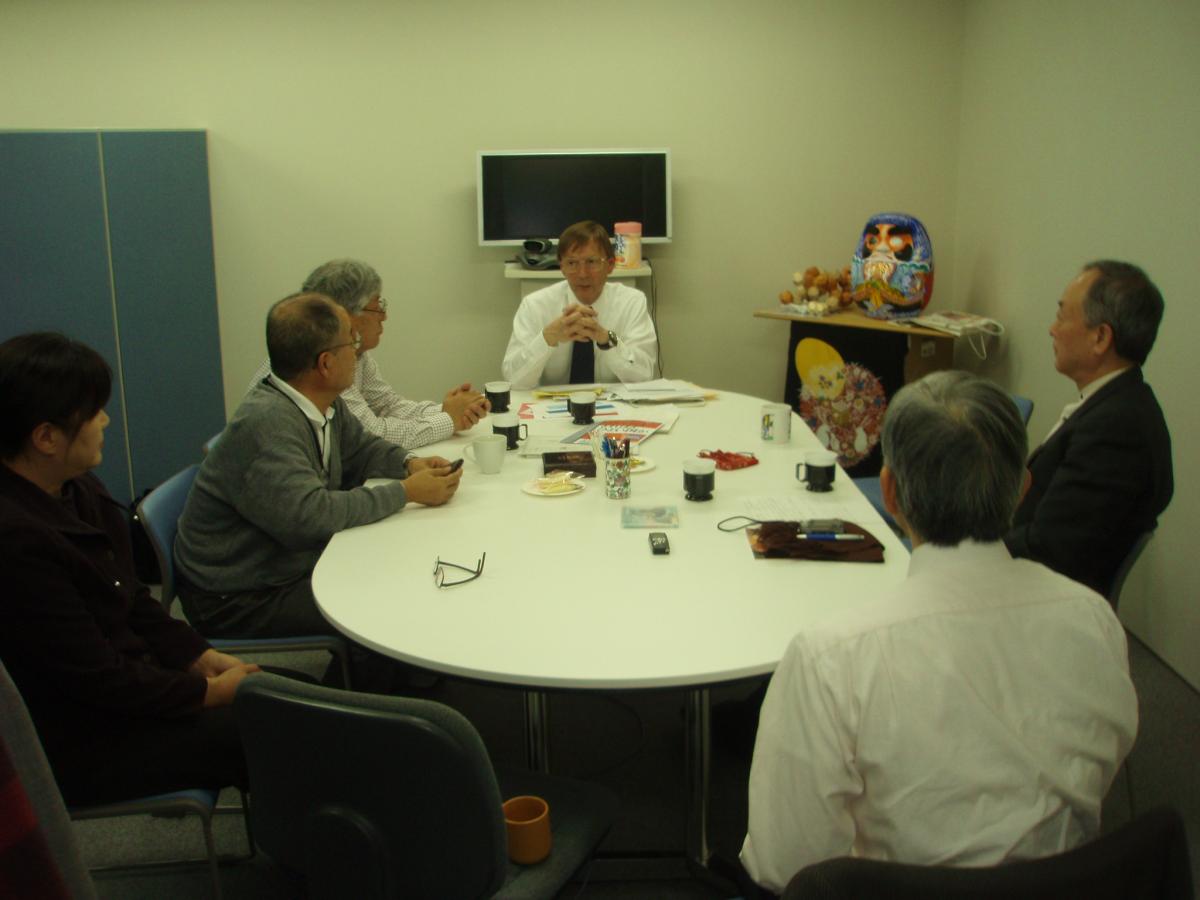 2月14日(水)社団法人日本電気協会主催の講演会に來仙した秋山仁氏は東北大学金属材料研究室川添研究室を訪れ、多面体木工や四角ドリルについて当NPO会員たちと談笑。同時に当NPOの活躍に賛同された秋山氏はその場で会員登録。