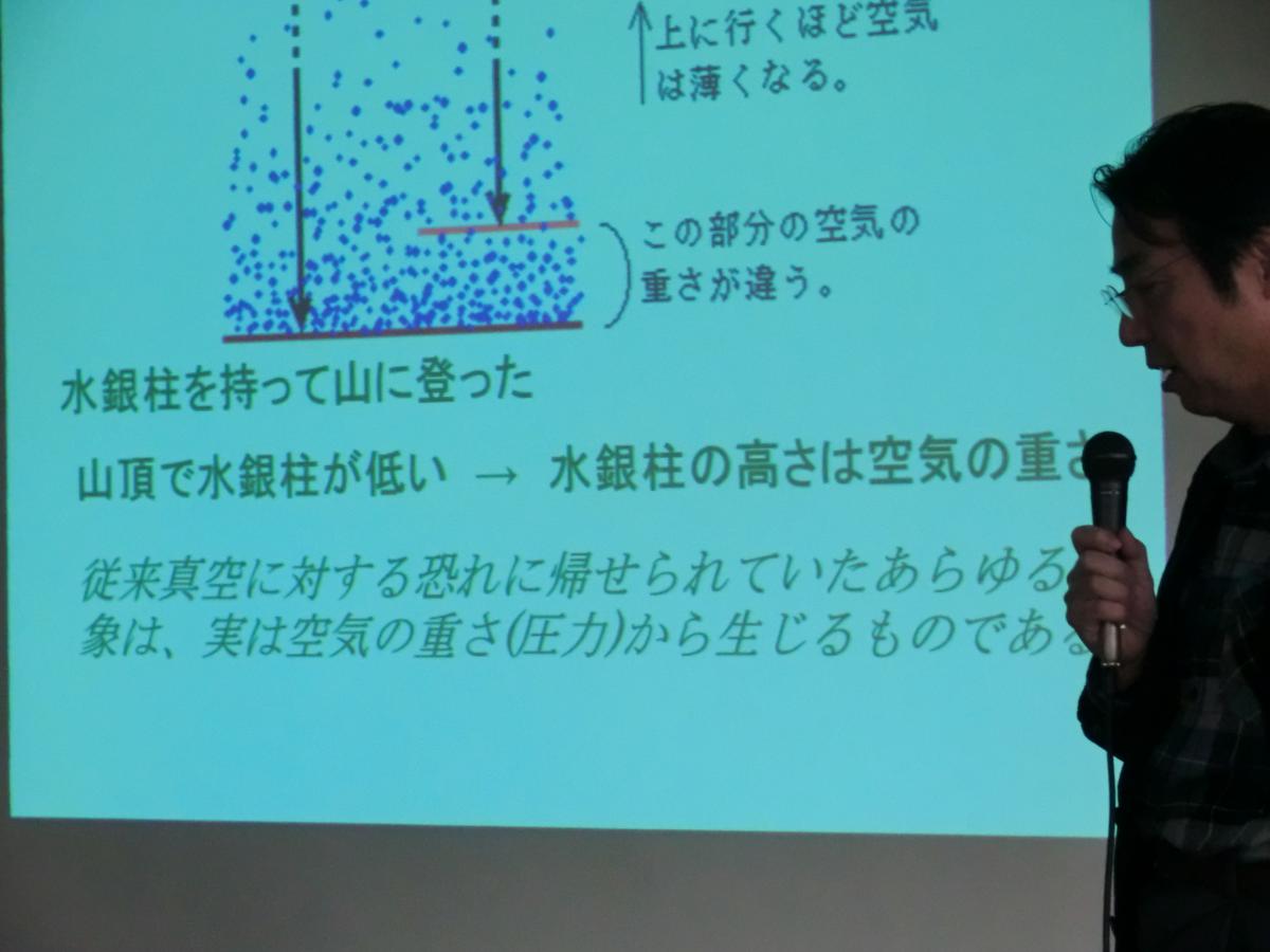 天候が気圧と関係することは既に1670年ころにはバネの法則で有名なフックによって知られていた、と言うお話しから講演が始まりました。そして世界最初の天気図は1783年3月6日の日付になっており、作られたのが33年後の1816年ころと聞かされ、科学の進歩のおもしろさも感じました。